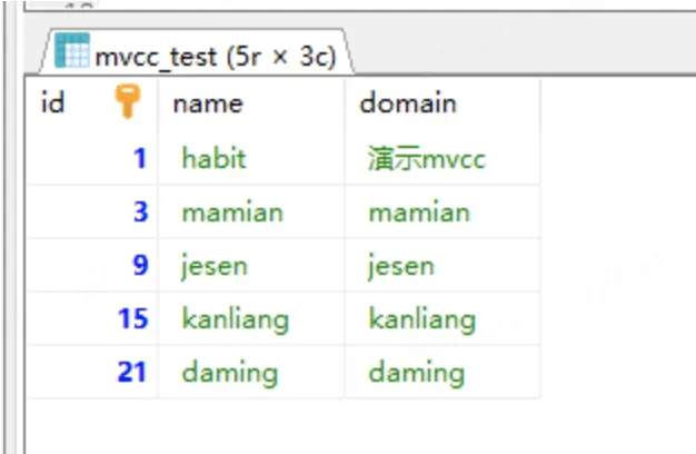 INSERT INTO mvcc_test VALUES(1, 'habit', '演示mvcc');