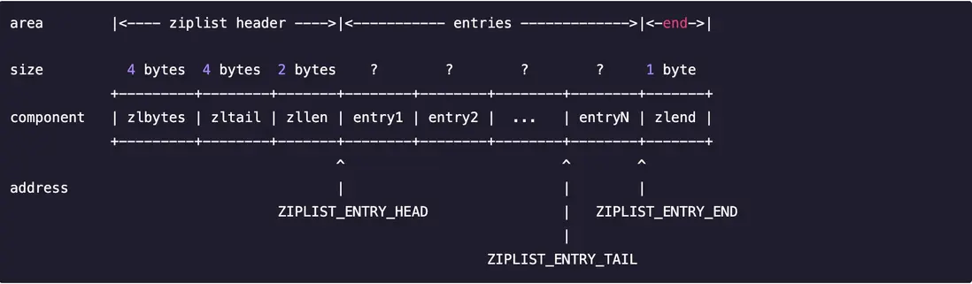 - zltail:4byte 記錄壓縮列表表尾節點距離壓縮列表的起始地址有多少字節: 通過這個偏移量,程序無須遍歷整個壓縮列表就可以確定表尾節點的地址。