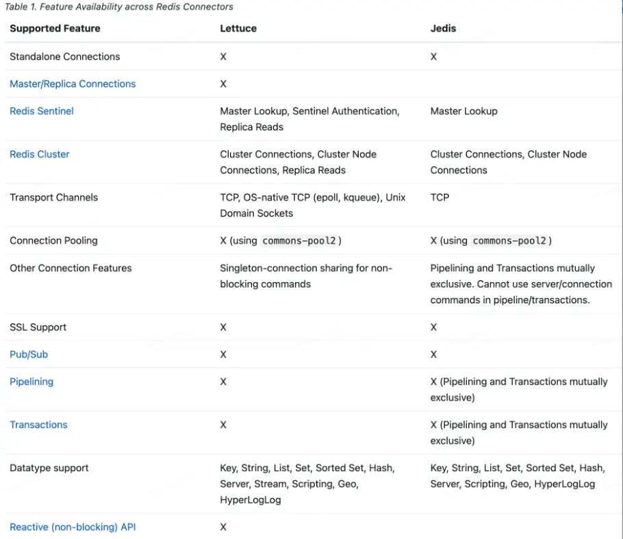 我們可以看下 Spring Data Redis 幫助文檔給出的對比表格,裏面詳細地記錄了兩個主流Redis客户端之間的差異。