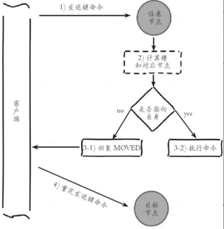 1)客户端根據本地slots緩存發送命令到源節點,如果存在鍵對象則直 接執行並返回結果給客户端