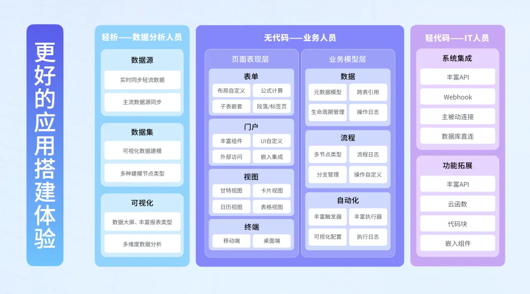 逐步發展為快速解決業務問題的應用開發平台和麪向中大客户的企業級平台這兩個套餐分級迭代。