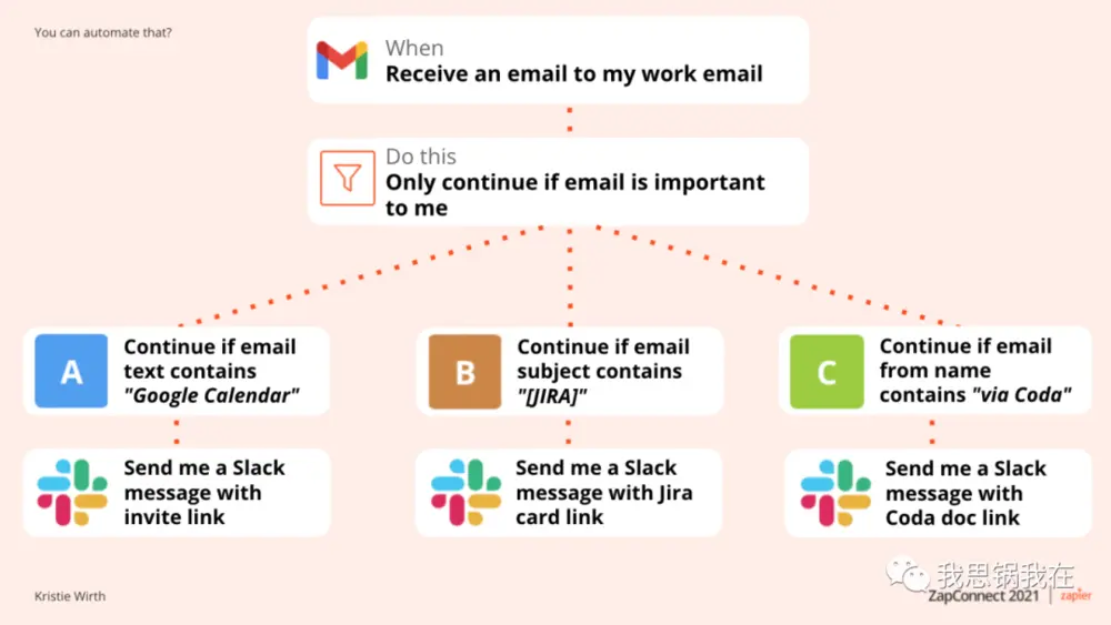 - 對於 B,我們可以參考蘋果的捷徑,國外的 Zapier,這些工具可編排邏輯,可通過引入更多應用和操作來擴展使用場景,在使用難度和邏輯可維護性上做到了一個好的平衡