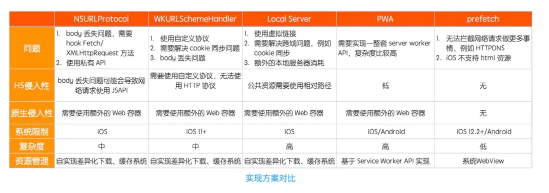PWA提供了一整套Service Worker API來實現離線H5能力,包括資源的下載、更新、緩存策略等。只不過iOS系統本身沒有提供默認的實現,需要自實現一整套相關的 Service Worker API,複雜度和工作量比較高。
