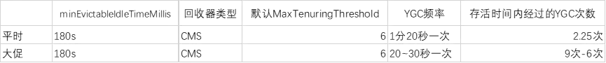 可以看到平時由於業務量小,GC不頻繁,過期連接沒有達到進入老年代閾值,在年輕代被回收。而大促時業務量大,GC頻繁,連接在進入老年代以後才過期,導致老年代FullGC時間過長。