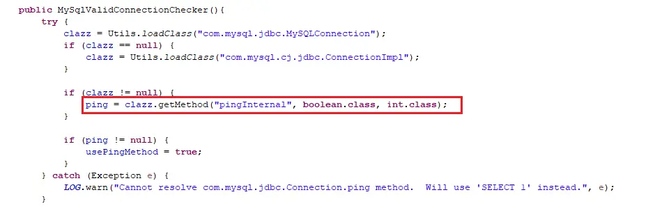 2、 Druid連接池配置的“validationQuery”語句通常並不會被執行,MySqlValidConnectionChecker在檢查連接有效性時,會判斷驅動是否實現pingInternal方法,如果實現則會通過此方法驗證有效性。MySQL的JDBC驅動實現了該方法,因此“validationQuery”配置的語句通常不會執行;