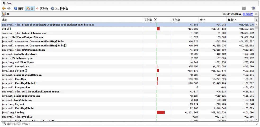 3、 推斷FullGC耗時過長是否因為老年代有大量死亡對象,遂導出FullGC前後堆內存dump,通過比對“保留大小”,發現FullGC後大量數據庫相關對象被回收。