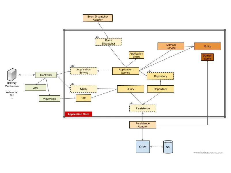 這個層包括了應用服務(以及它們的接口),也包括了端口與適配器架構中的接口,例如 ORM 接口、搜索引擎接口、消息接口等等。如果我們使用了命令總線和查詢總線,命令和查詢分別對應的處理程序也屬於這一層。