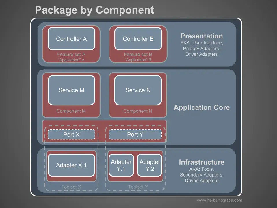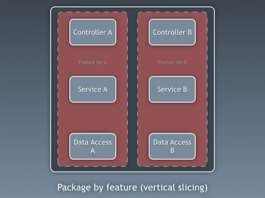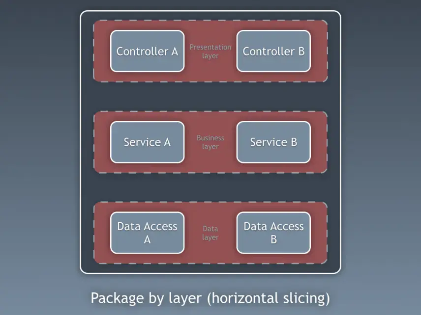 我是“按組件分包”方式的堅定擁護者,在此我厚着臉皮將 Simon Brown 按組件分包的示意圖做了如下修改: