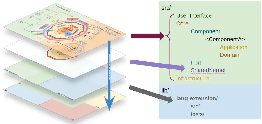 第二張則是一組平面的層級,其中最上面的一層就是前面這張同心圓,下一層是組件之間共享的代碼(共享內核),再下一層使是我們自己對編程語言的擴展,最下面一層則是實際使用的編程語言。這裏的依賴方向是自上而下的。