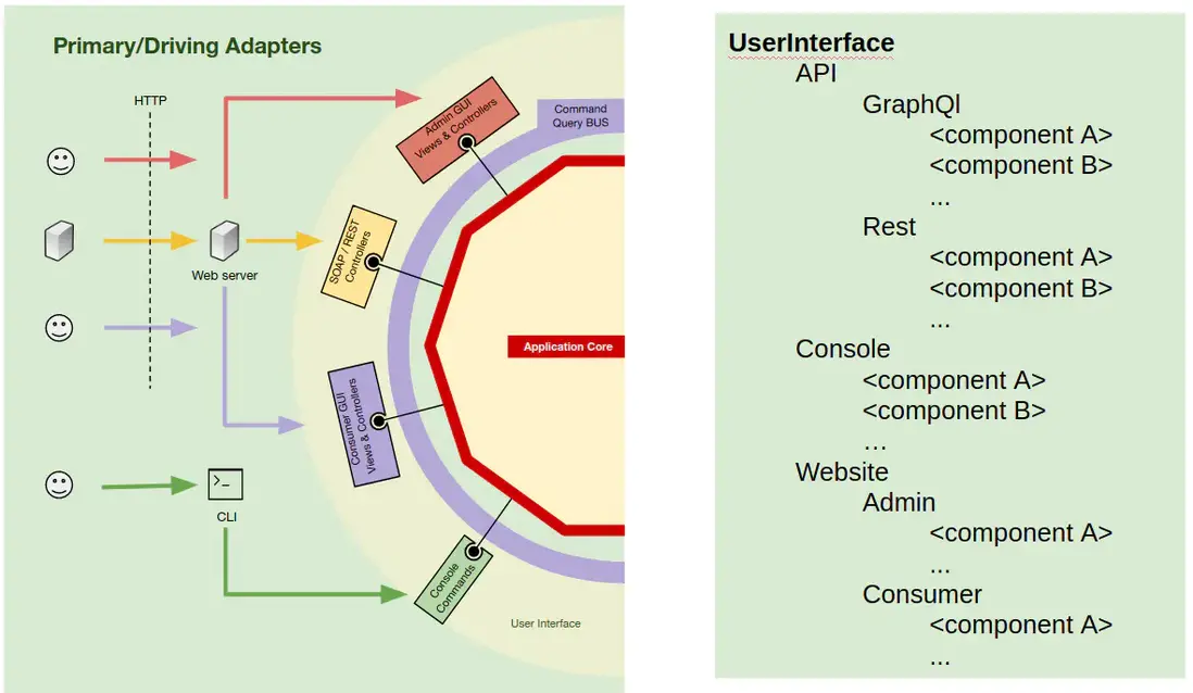 再舉一個更具體的例子,端口就是 Controller 需要的 Service 接口或者 Repository 接口。Service、Repository 或 Query 的具體實現被注入到 Controller 供 Controller 使用。