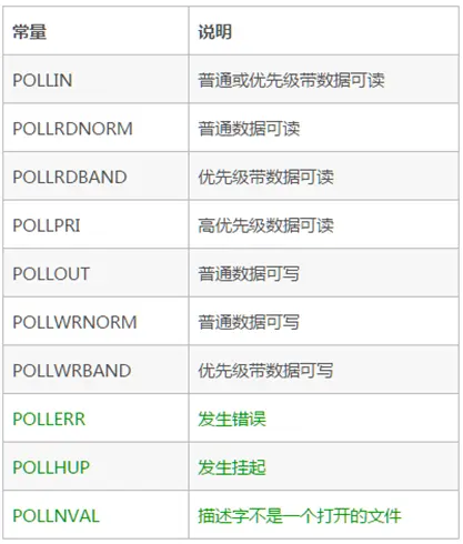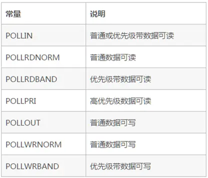 從上面的結構可以看出,fd很明顯就是指文件描述符,也就是當客户端連接上來後,fd會將生成的文件描述符保存到這裏;而events則是指用户想關注的事件;revents則是指實際返回的事件,是由系統內核填充並返回,如果當前的fd文件描述符有狀態變化,則revents的值就會有相應的變化。