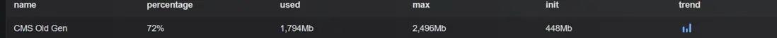 根據JVM啓動參數確定堆內存達到70時進行垃圾回收, 系統進行垃圾回收時堆內存佔比72%(跟上面的72%對應)一直大於70%,那麼使用內存是0.72 * 2496Mb ≈ 1794Mb(跟上面的1794Mb對應)