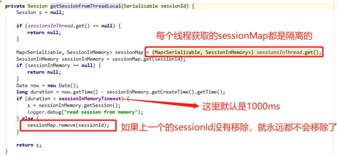下面的方法主要整合了獲取Session操作和設置Session操作,如果從ThreadLocal中沒有獲取到或者本地緩存超過1秒了就返回null,判斷為null之後就會從redis中獲取並新建一個Session存儲到ThreadLoca中