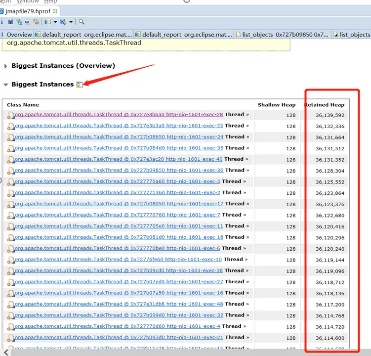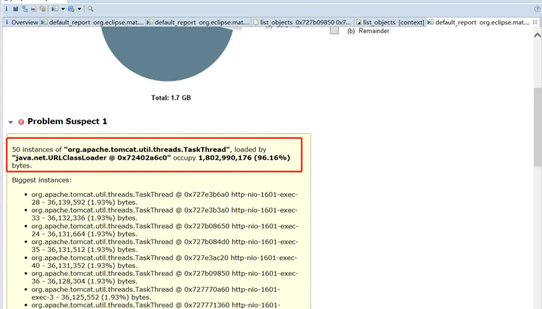 從堆棧文件分析結果中發現有50個org.apache.tomcat.util.threads.TaskThread佔用空間很大。共佔用空間96.16%