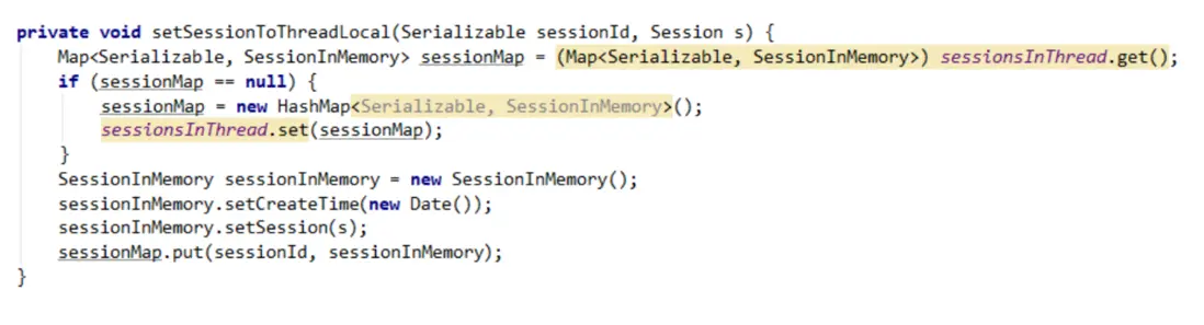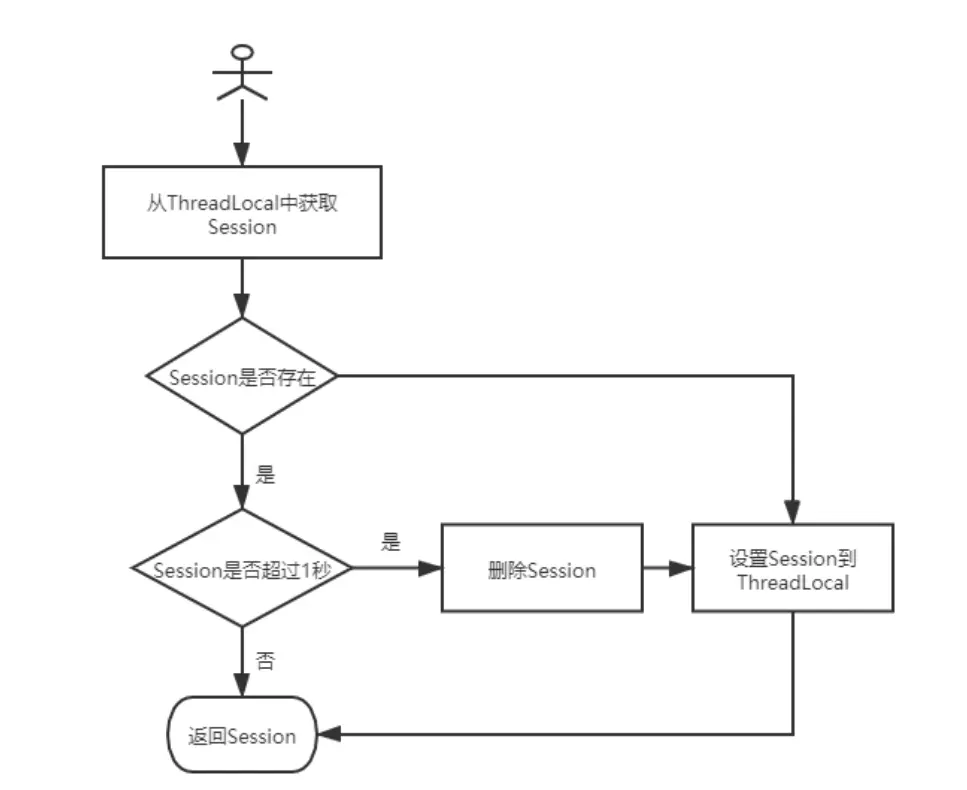 所以代碼的完成流程總結:獲取 Session 的操作是調用 getSessionFromThreadLocal()方法,如果沒有獲取到 Session 就返回 null,調用 setSessionToThreadLocal()方法會重新設置一個 Session。如果 Session 在當前線程的保存時間超過 1 秒就 remove。
