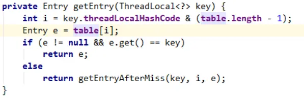 從 ThreadLocalMap 中獲取指定的 value,又有個疑問,獲取 Entry 為什麼還要從一個 table數組中拿呢?這個很好理解一個線程不一定只有一個 ThreadLocal 變量吧,多個 ThreadLocal變量就是有多個 key,所以就放到 table 數組裏面了