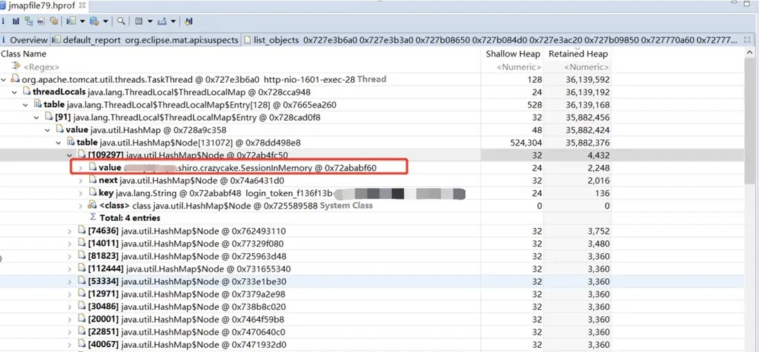 查看內存詳情保存最大最多的對象是ThreadLocal中存儲的SessionInMemory對象