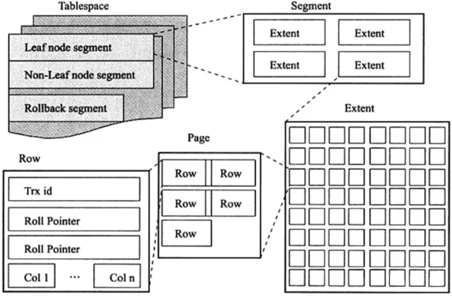 表空間又由段(segment)、區( extent)、頁(page)組成,頁是InnoDB磁盤管理的最小單位。在我們執行sql時,不論是查詢還是修改,mysql 總會把數據從磁盤讀取內內存中,而且在讀取數據時,不會單獨加在一條數據,而是直接加載數據所在的數據頁到內存中。表空間本質上就是一個存放各種頁的頁面池。