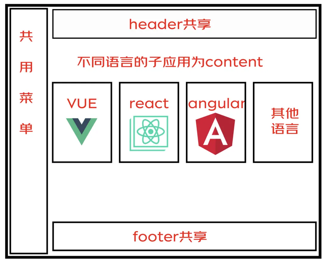content裏面可以任意放不同技術的子應用,我們只需要開發一個主應用(主應用也可以自由選擇語言,目前支持react、vue、vite、angular、next.js、nuxt.js),將一些分散的應用接進來,主應用還可以通過控制權限,讓不同的賬號看到的菜單不一樣,即看到不同系統的頁面,通過同一個地址訪問到不同的子應用。