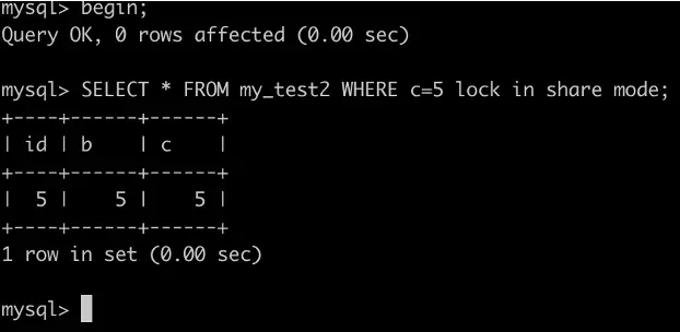 事務A執行SELECT * FROM my_test2 WHERE c=5 lock in share mode;