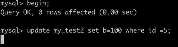 | T1 | BEGIN; SELECT * FROM my\_test2 WHERE b=5 FOR UPDATE; UPDATE my\_test2 SET c=10 WHERE b=5; | ||