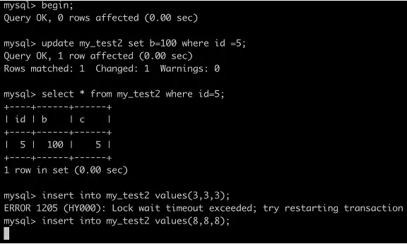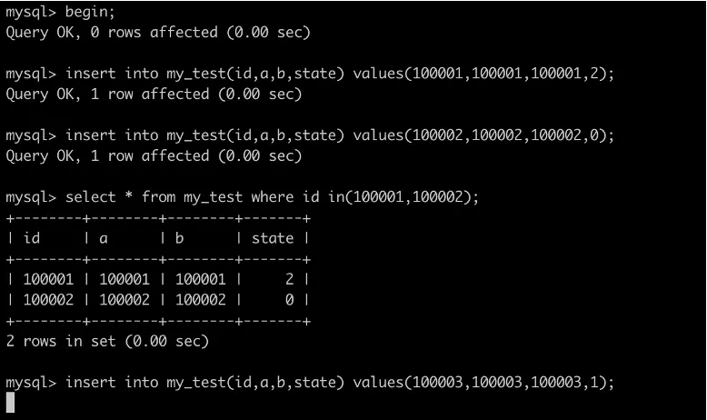 INSERT INTO my_test2 VALUES(1,0,0); //阻塞