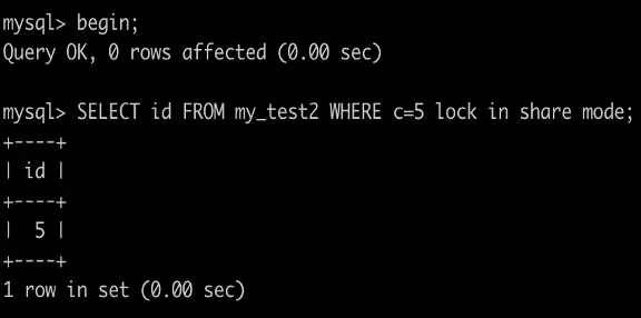 事務A執行SELECT id FROM my_test2 WHERE c=5 lock in share mode`;`