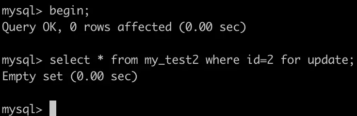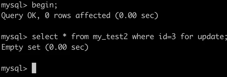 2. 事務B執行SELECT * FROM my_test2 WHERE id=3 for UPDATE;,同樣也會鎖住(0,5)這個間隙,而且可以成功。