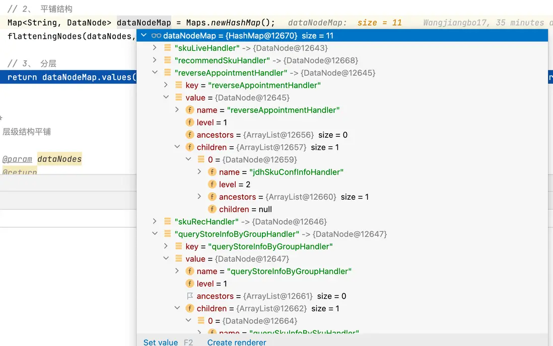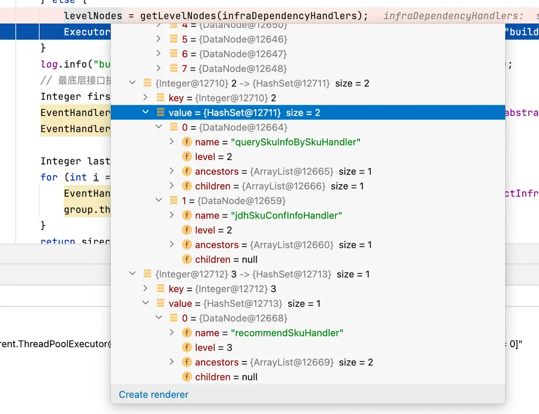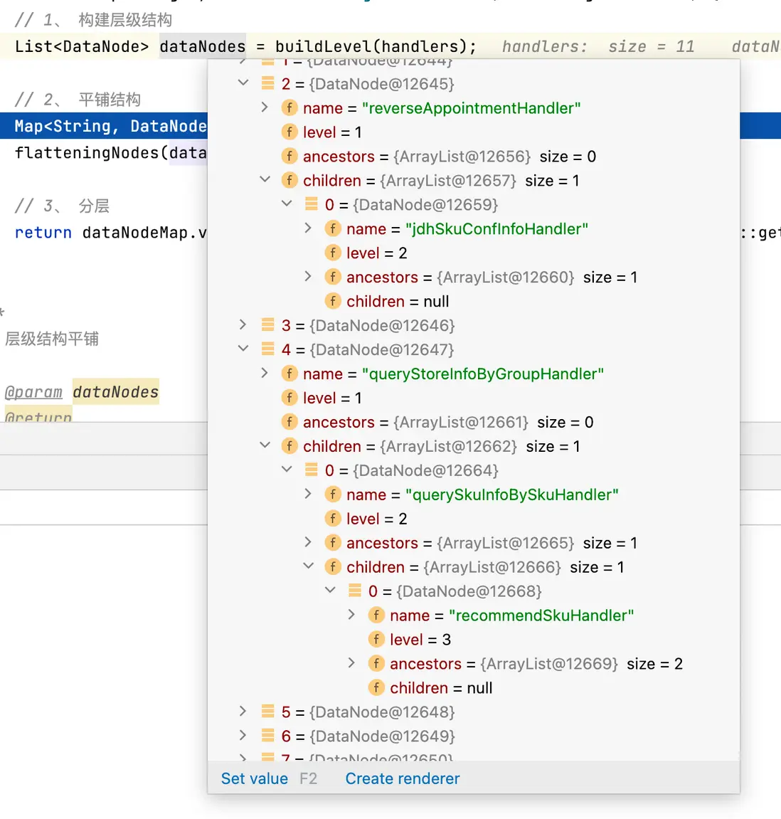 流處理平鋪結構,處理層級分組,存儲在TreeMap中維護自然排序。對應key中的數據節點Set<DataNode>需用多線程併發調用,以保證鏈路調用時間