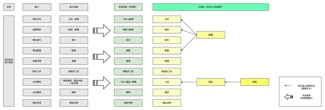 到店商詳迭代過程中,需要提供的對外能力越來越多,如預約日曆、附近門店、為你推薦等。這其中不可避免會出現多個上層能力依賴同一個底層接口的場景。最初採用的方案是對外API入口進來後獲取對應的能力,併發調用多項能力,由能力層調用對應的數據鏈路,進行業務處理。然而,隨着接入功能的增多,這種情況導致了底層數據服務的重複調用,如商品配置信息,在一次API調用過程中重複調了3次,當流量增大或能力項愈多時,對底層服務的壓力會成倍增加。