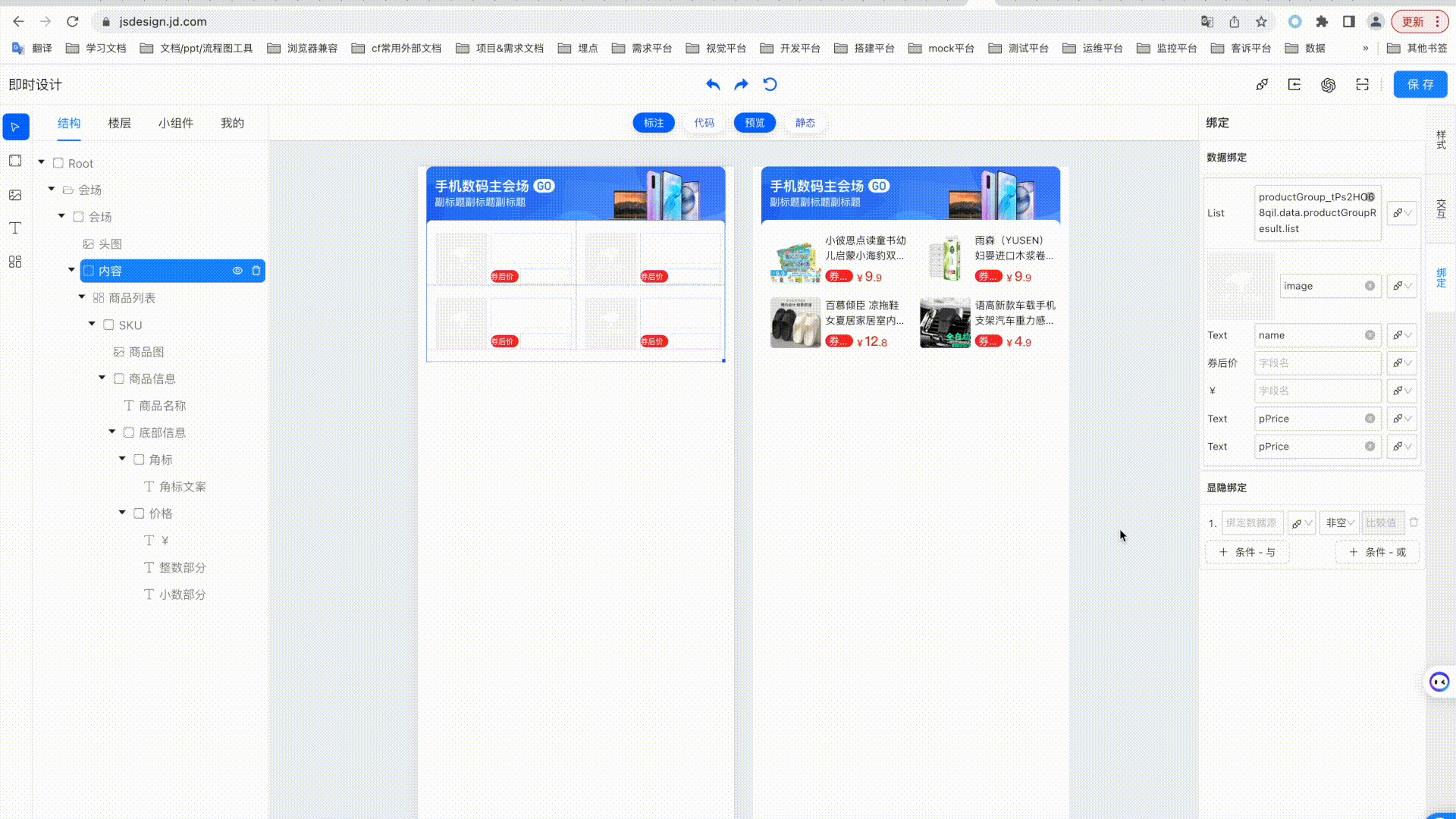 •顯隱綁定:通過添加條件,選取數據源/狀態管理/頁面參數,在樓層被使用並運行時,對所選值與填入的比較值比較,得出該節點元素顯示或隱藏的控制結果;