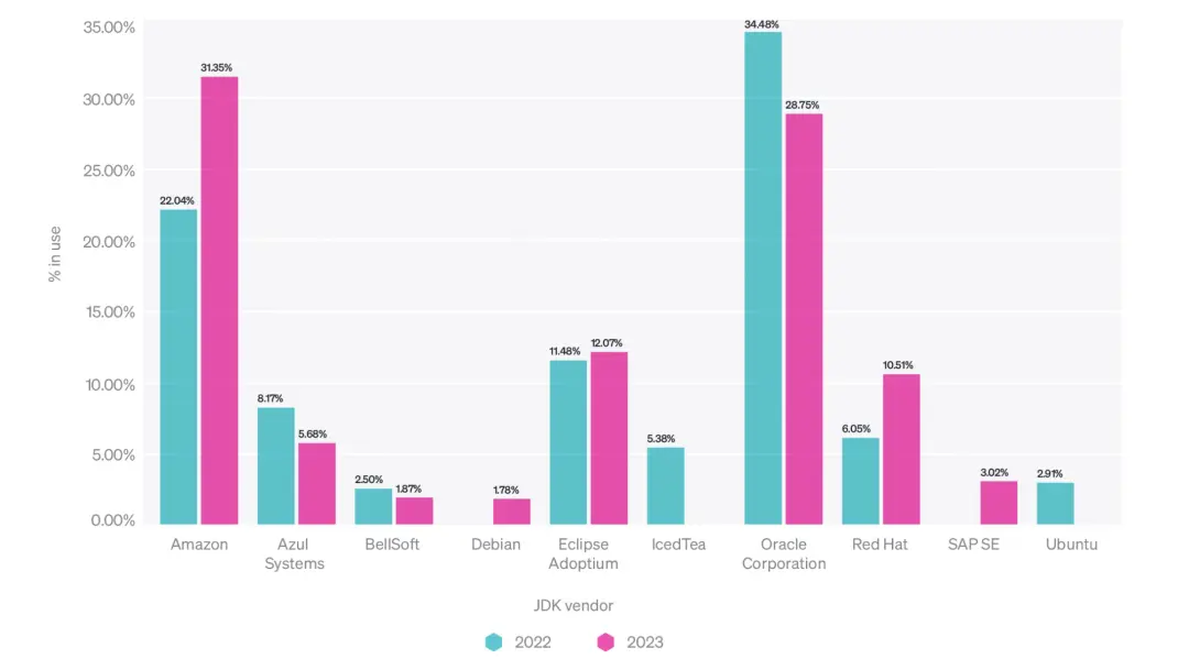 在JDK 的廠商上面,Amazon這兩年的增長量是比較大的,從22%上升到了31%,是目前市面上的各個JDK廠商中佔比最高的。