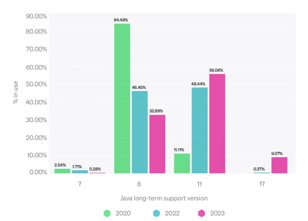 目前市面上有超過56%的應用程序使用了JDK 11,而相比之下,Java 8 的使用從2020年的84%降低到了現在的32%左右,大部分公司在這三年之間都升級到了JDK 11 或者 JDK 17這兩個LTS版本上面。