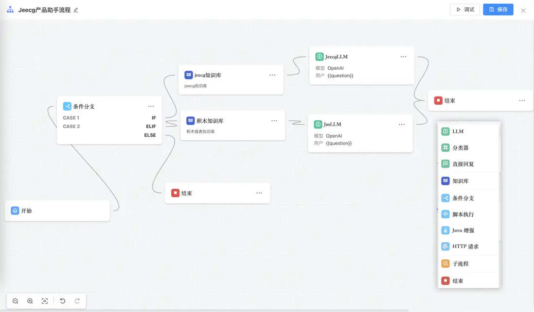 目前支持的節點有:開始、結束、AI知識庫節點、AI節點、分類節點、分支節點、JAVA節點、腳本節點、子流程節點、http請求節點、直接回復節點等節點