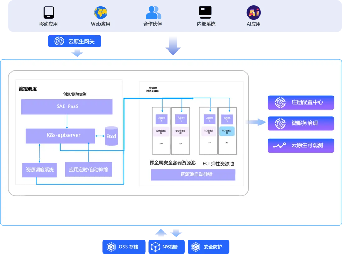 SAE 背後打通神龍裸金屬服務器、彈性容器實例(ECI)支持各代 x86/ARM等海量資源,形成統一調度池。 - 智能跨機型調度: