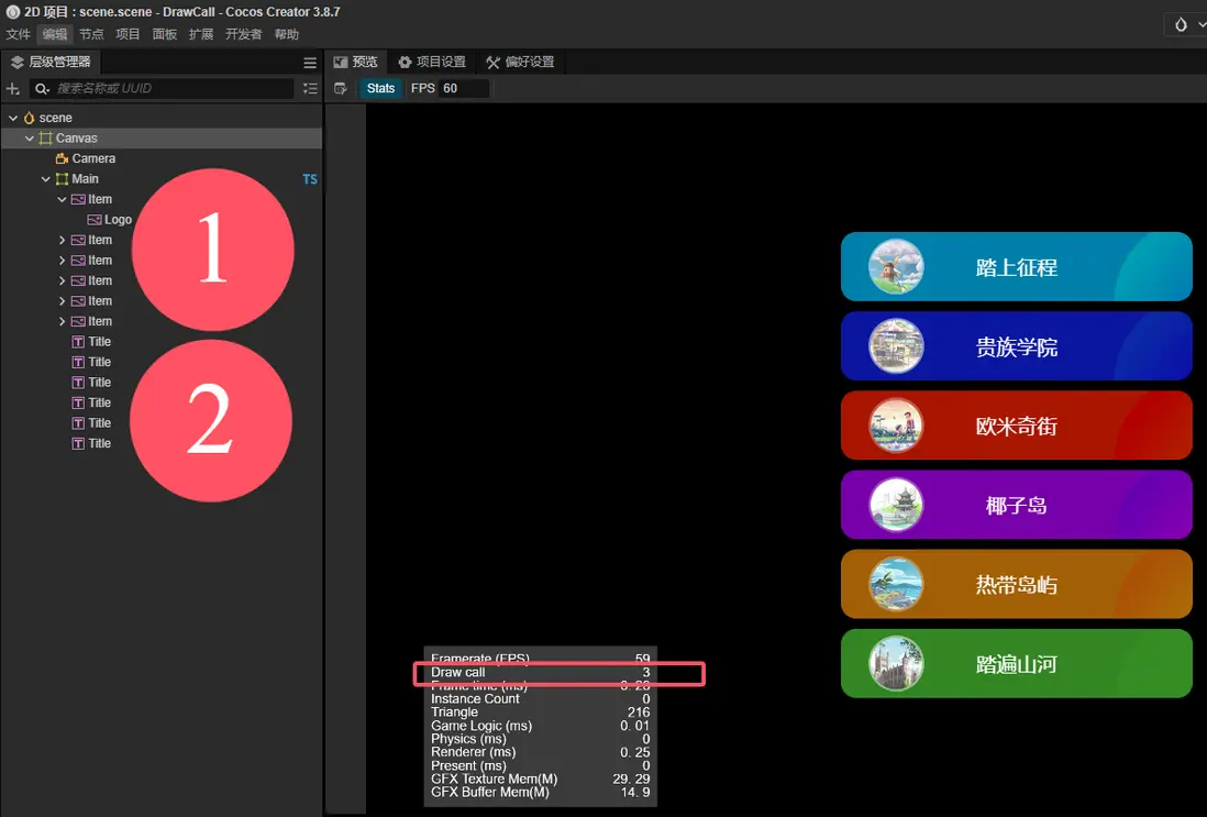 接下來給大家演示一個簡單的降低DrawCall的例子,但是不同的項目有不同的難度,本例子只做演示。