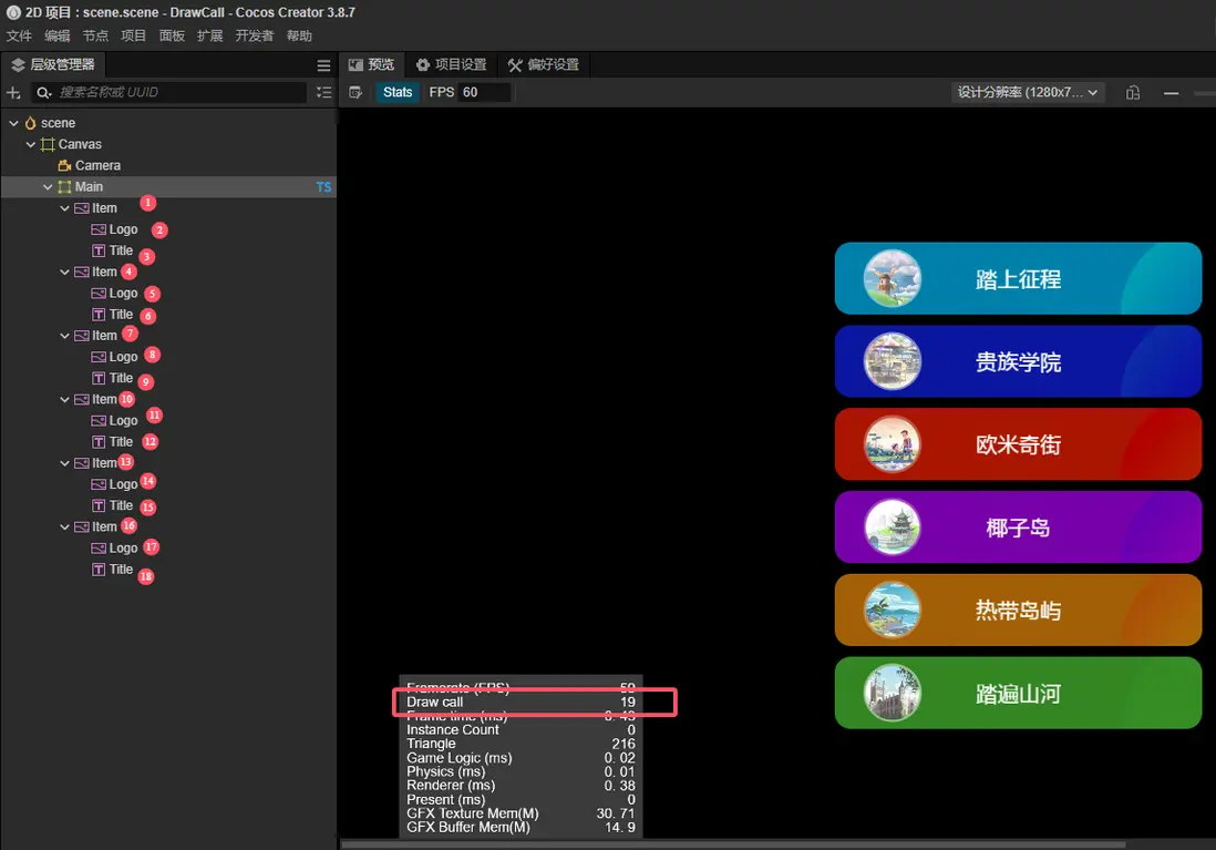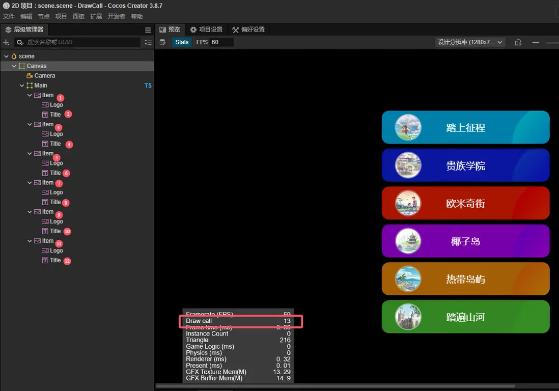 圖集處理好之後運行看下效果,使用圖集之後,DrawCall降低到13個了。