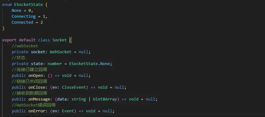 包括Socket連接狀態枚舉(未連接,連接中,已連接),核心模塊WebSocket模塊,以及一些回調: