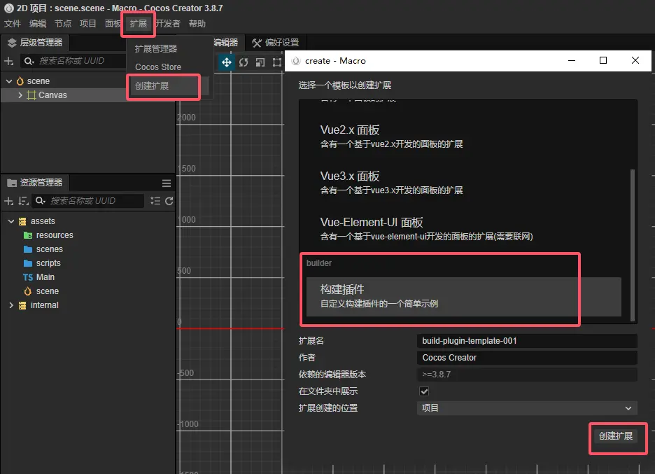 首先要創建我們的插件,通過菜單擴展->創建擴展打開擴展創建面板,選擇構建插件,並且通過擴展管理器啓用插件。