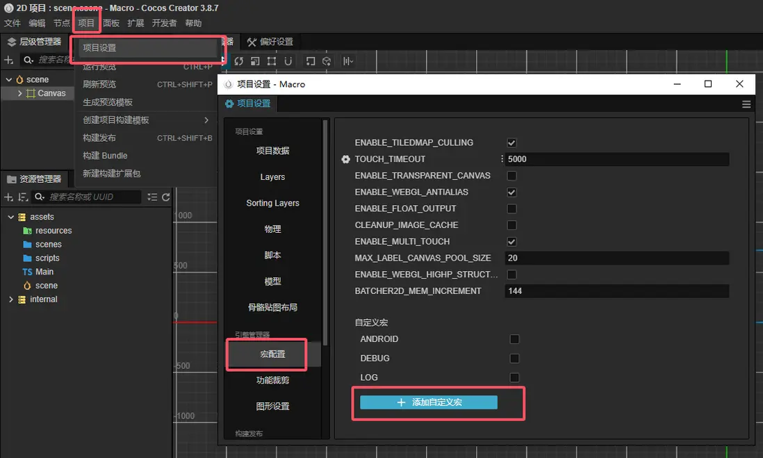 Creator中的宏定義可以通過菜單項目->項目設置->宏配置打開面板進行編輯(CRUD)。