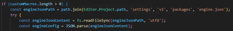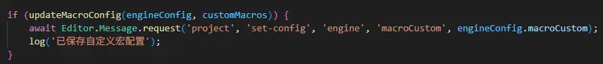 await Editor.Message.request('project', 'set-config', 'engine', 'macroCustom', engineConfig.macroCustom);消息進行保存。