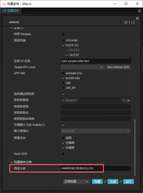 新建android平台,自定義宏中輸入ANDROID;DEBUG;LOG。