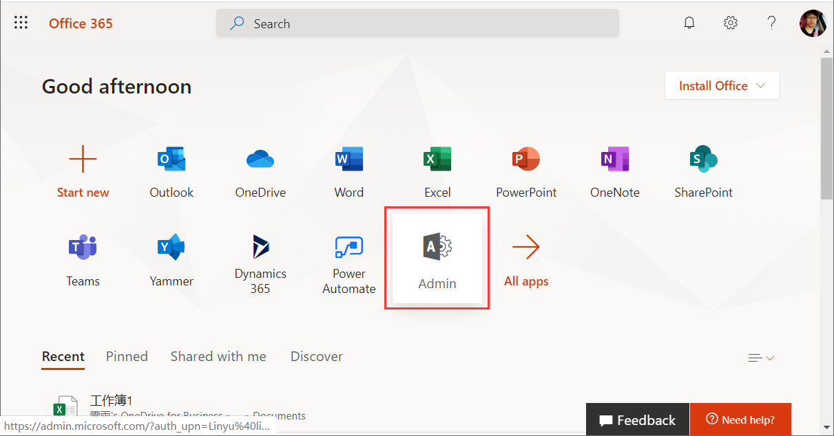 當我們新申請的Office環境,可能並不能在左側導航中看到,因為Office需要在後台幫我們創建SharePoint環境,需要等一段時間才會出現。如果遲遲不能顯示,我們可以嘗試手動敲Url地址訪問https://domain-admin.sharepoint.com