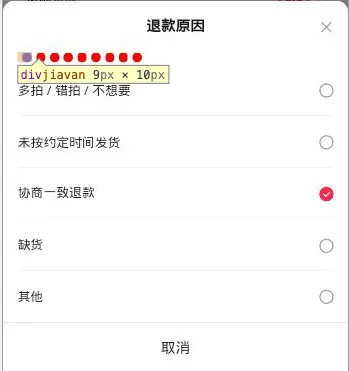 在實現一個 popup 組件或者 dialog 組件時經常會有一些選項,css 也是能繪製出來的,比如上面 9 個紅色的圓點,它們都是一個組件,預期寬高都是 10px,但是通過一系列的換算後第一個卻變成了 9px,第二個又是 10px,9 個原點渲染出來不盡相同。