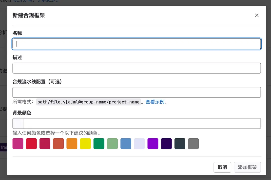合規流水線的使用,首先需要在羣組級別進行合規框架的配置。在羣組 → 設置 → 通用 → 合規框架中,選擇新建合規框架,然後填入合規框架名稱、描述、合規流水線配置(也就是合規流水線所存儲的位置),最後選擇一個背景顏色即可。