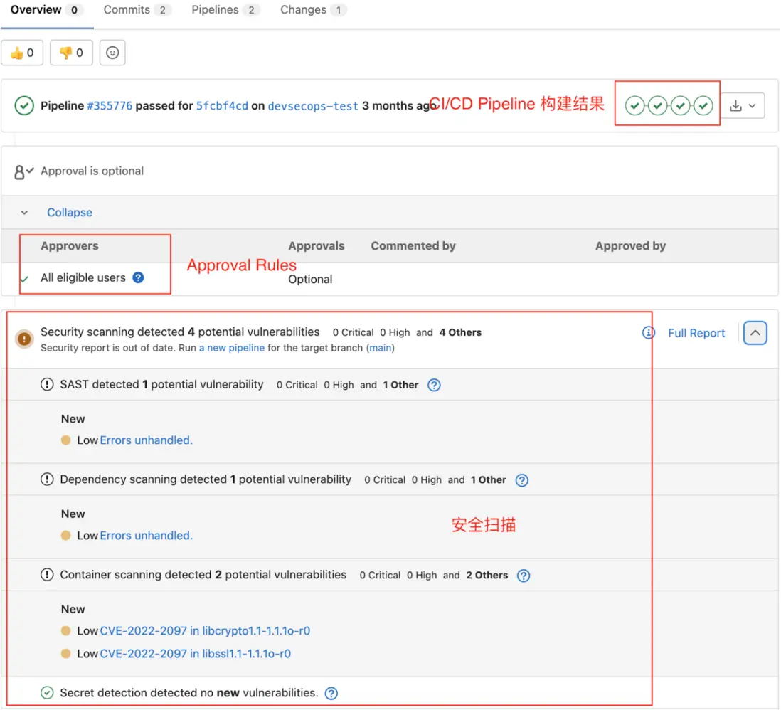 CI/CD 能夠完成變更代碼的自動化構建、測試、安全掃描等,不僅能夠加速代碼從變更到部署的速度,也保證了每次代碼變更都會經過同樣的構建、驗證流程。而且最重要的是 CI/CD Pipeline 的構建結果、測試結果、安全掃描等結果都可以直接反饋到 MR 中,為 Code Approver 提供數據決策: