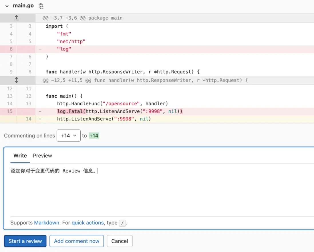可以在 MR 中直接指定 Reviewer 對於 Code 進行 Review,而且可以指定多個 Reviewer。Reviewer 可以在提交的變更文件中進行代碼 Review,如果需要添加 Review 意見,直接在對應的代碼行數前點擊 comment 圖標,即可出現添加 Review comment 的方框,輸入 Review comment,點擊 Start a review 即可。