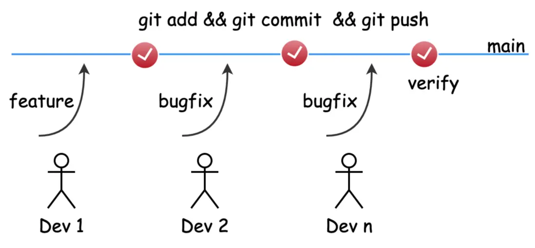由於 git 使用的複雜性,當團隊的 git 使用技巧(分支的管理、代碼的回退等)達不到一定程度時,在業務提交緊急時,git add && git commit && git push 就成了代碼提交三步曲,變更代碼被直接推送到主分支,走先提交再驗證的流程。