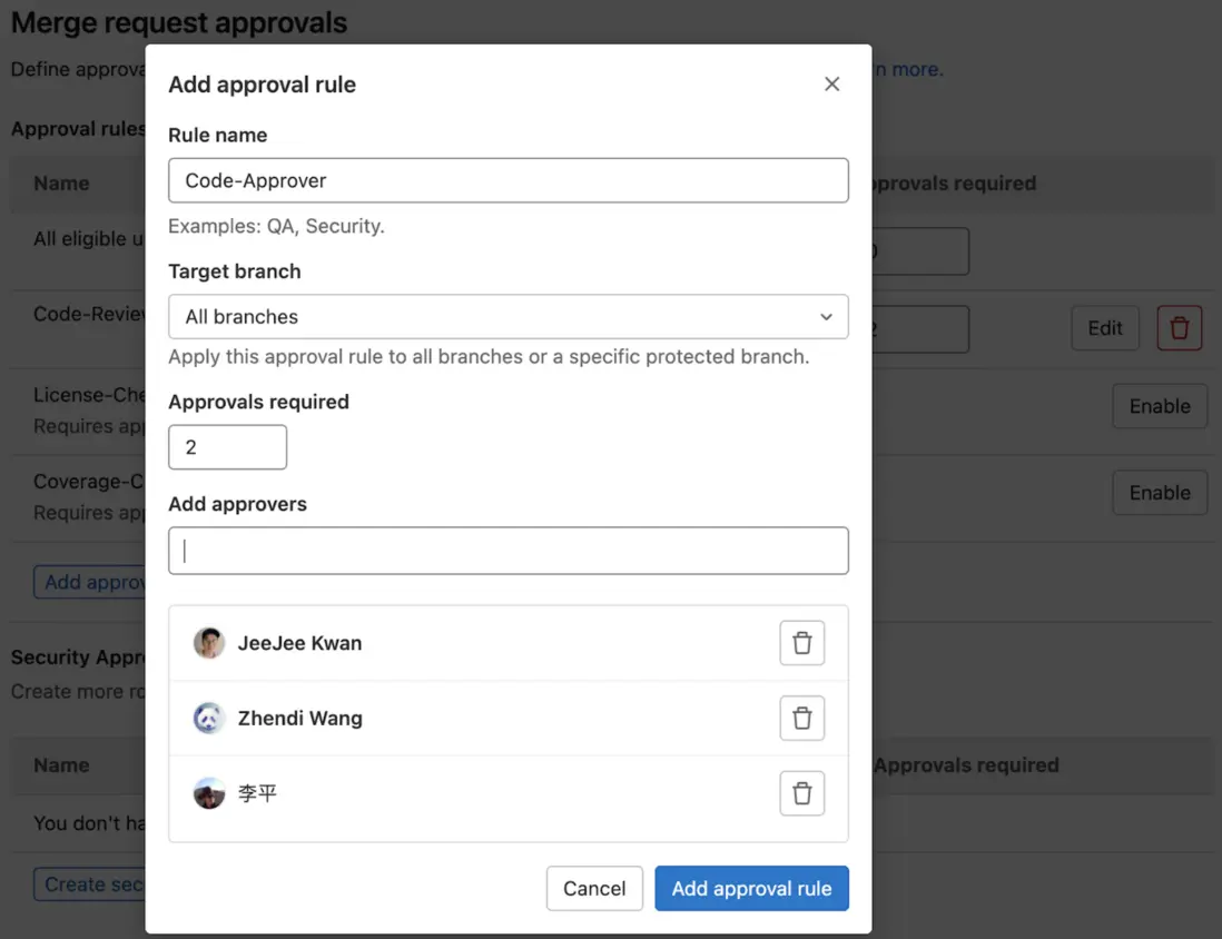 比如可以指定對應的 Approver 以及最少 Approve 人數以及 Rules 生效的分支: