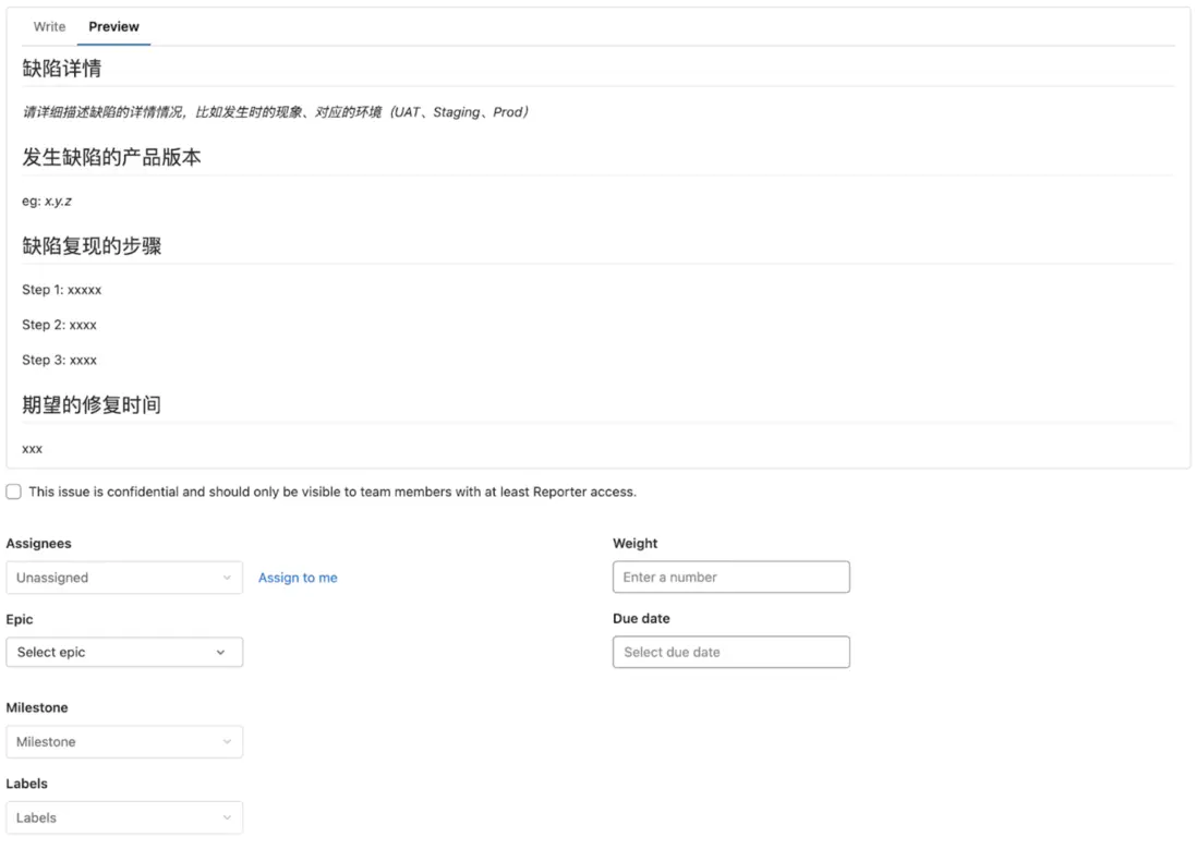 在 issue 描述中可以詳細描述缺陷的特徵、發現的版本、如何復現、期望修復時間等信息方便修復人員對於缺陷有更清晰的認識,再通過 assignees 來指定 issue 的具體負責人,將修復責任落到實處。